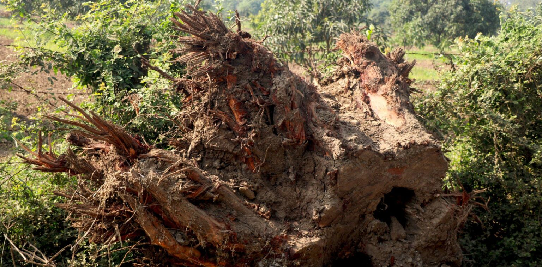 We inspect the size, depth, and root structure of large tree stumps before grinding.